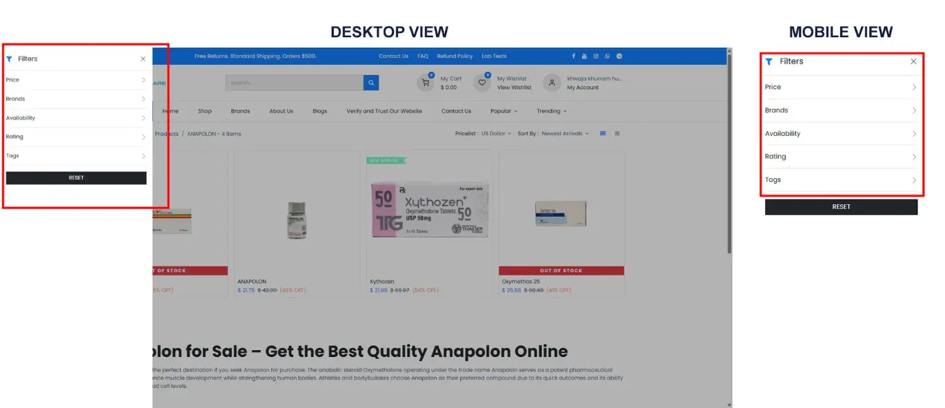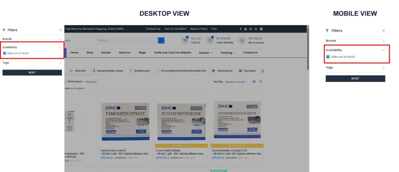 · Brands, Price, Availability, Rating, or Tags via the Show Filters button (select Hide out of stock from availability potton for veiw avilabil products only).