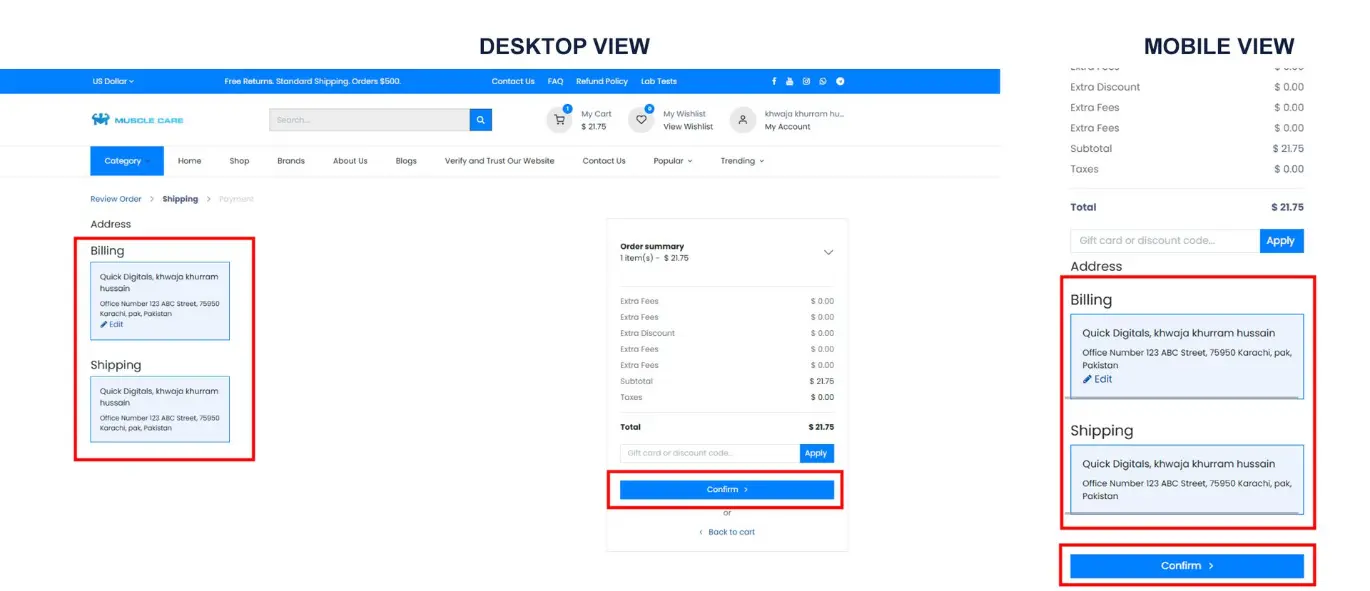 · Check shipping and billing addresses. Click Edit next to each address to make changes If riquiard , then select confirm.